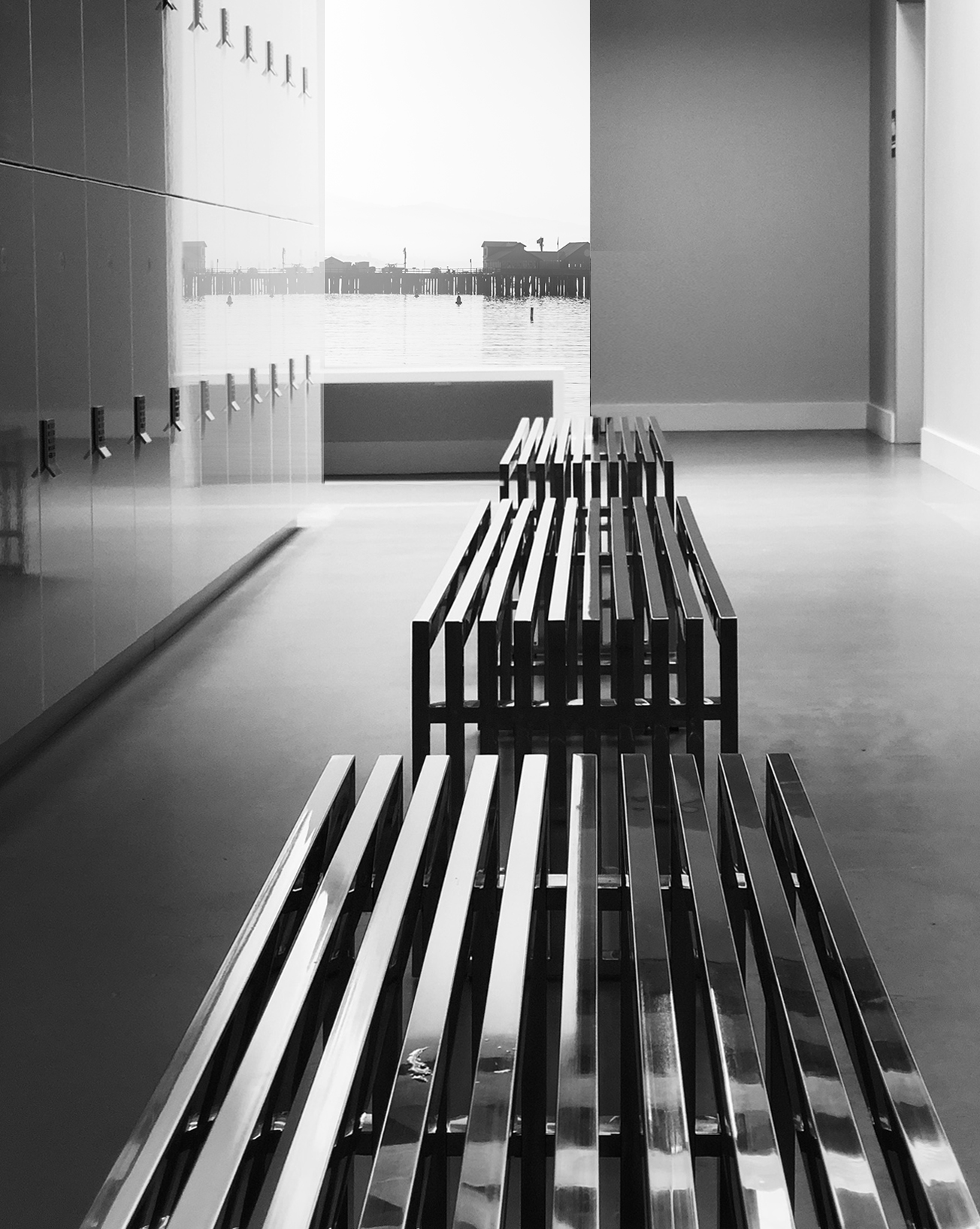 The addition of a large locker room with four enclosed bathroom/showers abut a back wall with its longer exterior wall covered in an oversized mural. Two existing bathrooms will be renovated in keeping with the locker room details.